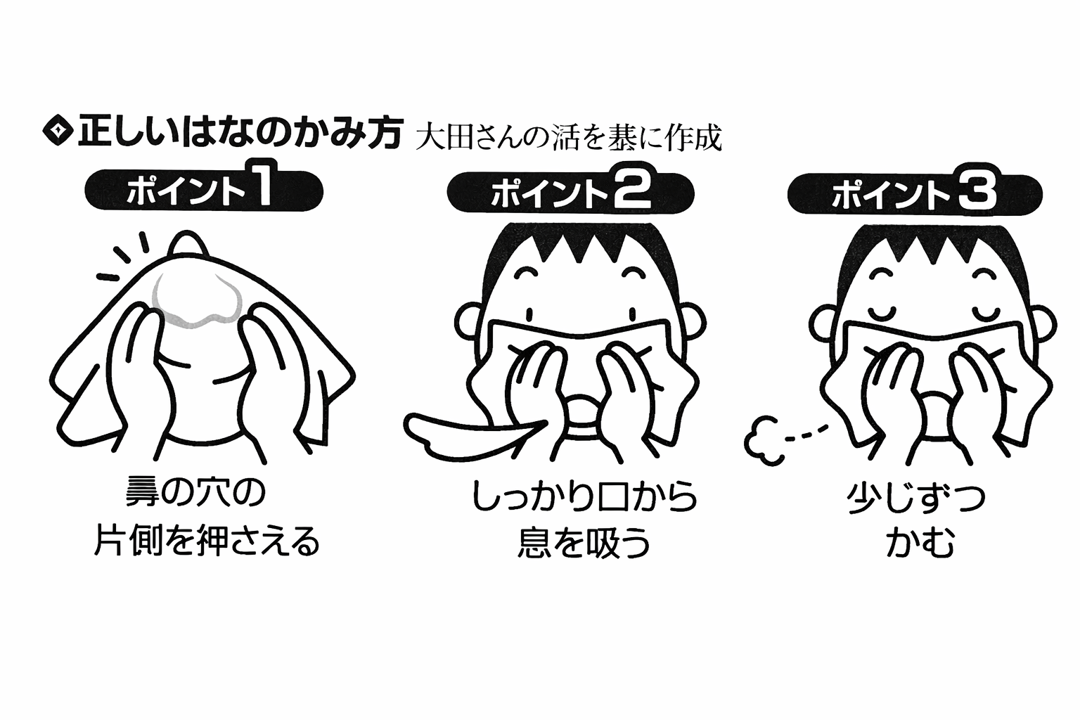 はなをかむのが苦手な子どもと一緒にできる練習方法もある。大王製紙でティッシュの商品企画を担当する森脇哲平さんは、「吸った息を鼻からはき出せるかが、ポイントです」と話す。