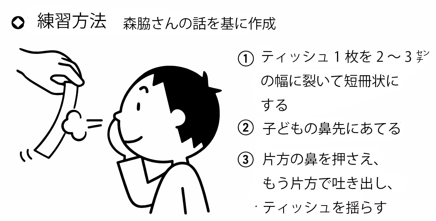 森脇さんが勧めるのは、ティッシュを使った方法。ティッシュ1枚を2~3センチ幅に裂き、子どもの鼻先にあてる。口から大きく息を吸い、いったん息をとめる。口を閉じ、片方の鼻を押さえ、もう一方の鼻だけで息をはく。きちんと息が出ていたらティッシュが揺れる。「親子で、どっちがはためくか競争をしてみても。ゲーム感覚で楽しく練習できるはず」と森脇さん。